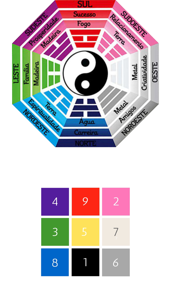 As 8 direções são uma espécie de rosa dos ventos com os quatro pontos cardeais principais e os seus intermédios. Acrescentando o centro no meio dessa rosa dos ventos, temos 9 zonas ou casas, e com elas formamos o Baguá, que também pode ser apresentado sob a forma de um quadrado mágico.